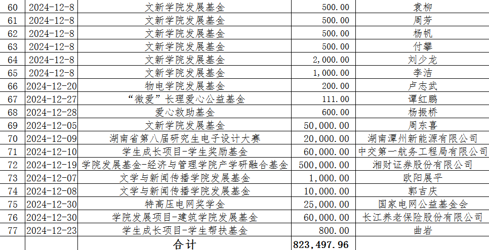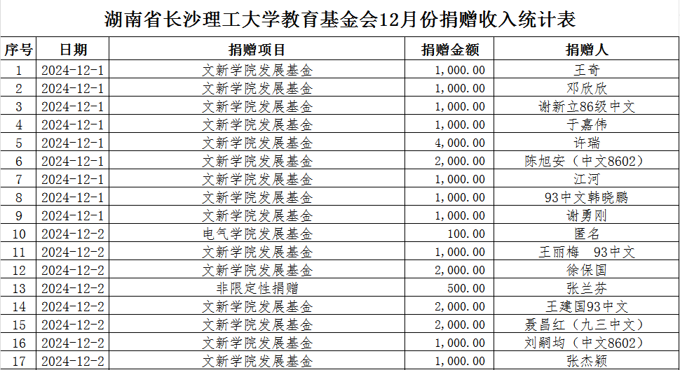 湖南省永利集团88304官网教育基金会2024年12月捐赠收入表