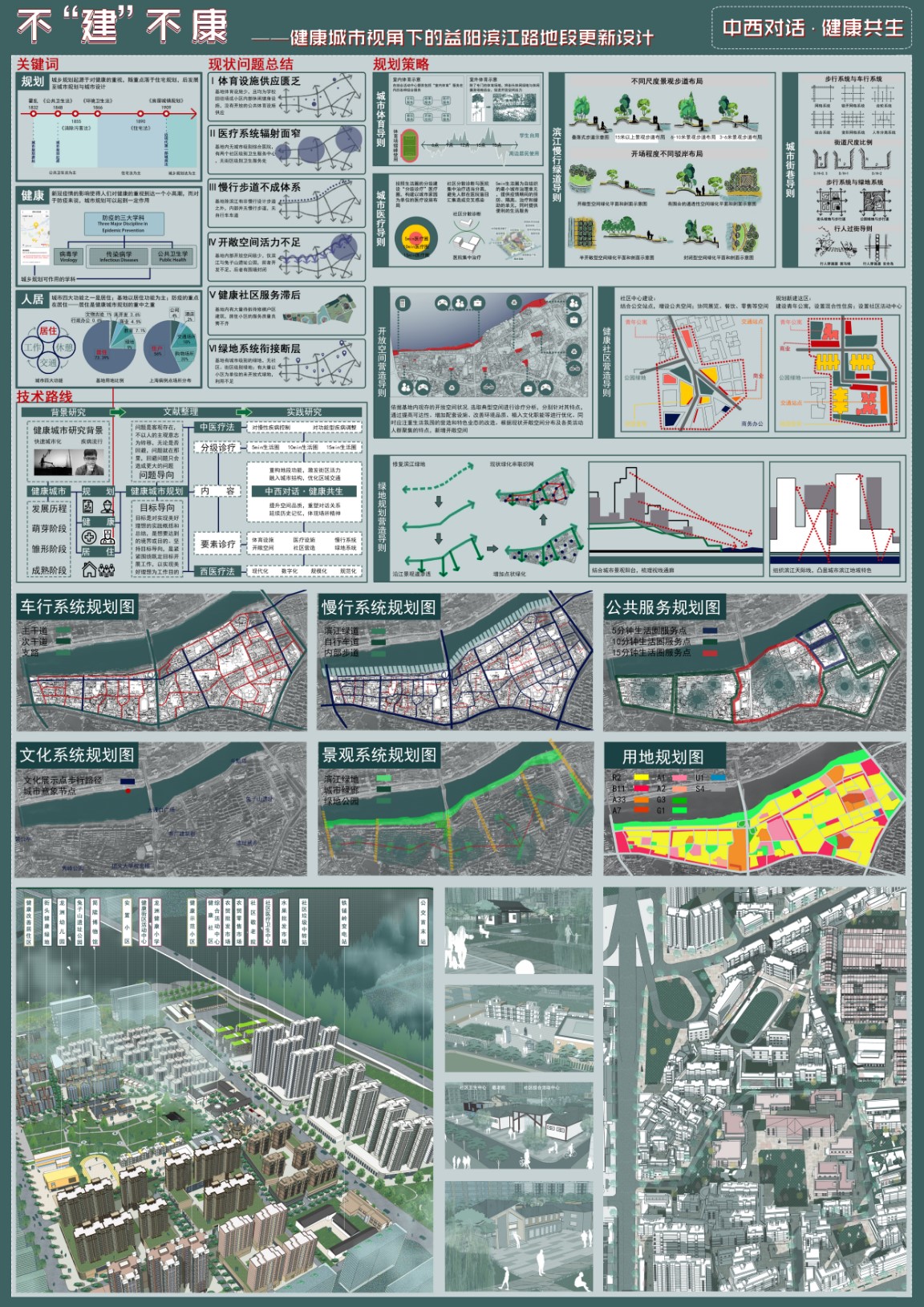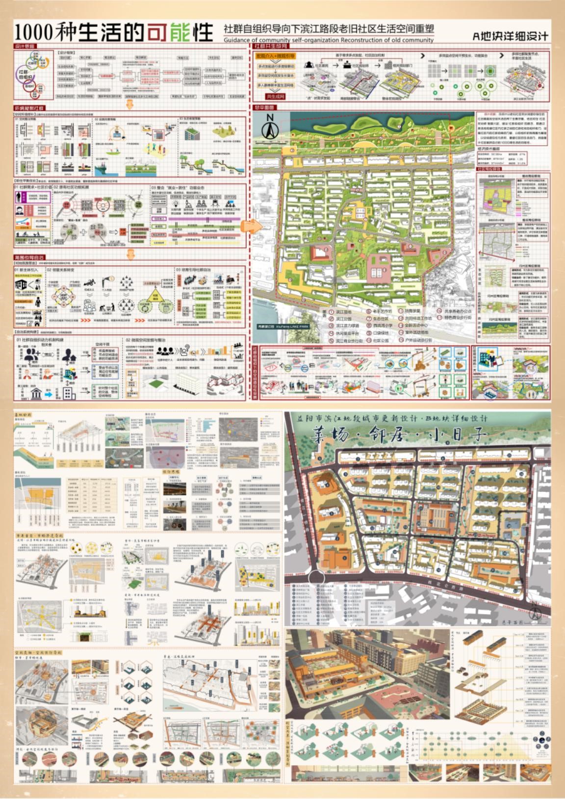 由邓斌、欧阳慧婷、黄铭东、张婷婷四位同学完成的两组方案均为益阳市滨江路地段老旧社区的更新设计。第一组方案“江南都市”提出“社群自组织”目标导向的概念,它强调社群性和自组织性,针对现状提出三大策略,一是市井重塑,二是空间交融,三是时空的共享。将基地更新改造成具有人间烟火味和市井小生活社区,以达到社会关系的共存,人群的共生以及空间的共享,最终实现“共建、共生、共享”的社区生活新模式。第二组方案“不建不康”基于中西医疗法理念,选取典型空间进行定性和定量相结合诊断分析,注重生活氛围的营造和特色业态的改造,以期获得健康的人居环境。两组方案概念新颖独特,得到专家一致好评。经过一天的方案展示、学生汇报、专家评审等环节,最终分别取得一等奖和三等奖的好成绩。本次竞赛成绩反映了我院城乡规划专业的办学实力,也凸显了永利官网学生的专业素养。我系将再接再厉,为社会培养高素质的人才,为国家城乡建设做出应有的贡献。