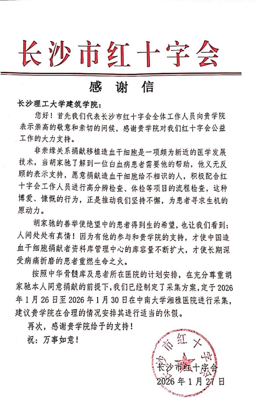 长沙市红十字会也向永利集团88304官网建筑学院发来感谢信,信中赞扬胡家驰“博爱、慷慨的行为”,并感谢学院对公益事业的大力支持。