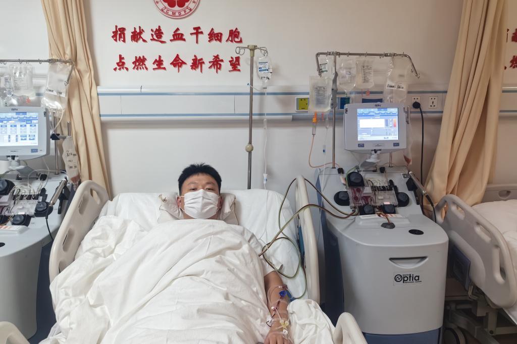 1月30日早上6点,他准时到达医院。注射最后一针动员剂、抽血检测指标达标后,8点正式上机采集,直至下午3点左右结束。期间,他始终保持着平静与坚定。