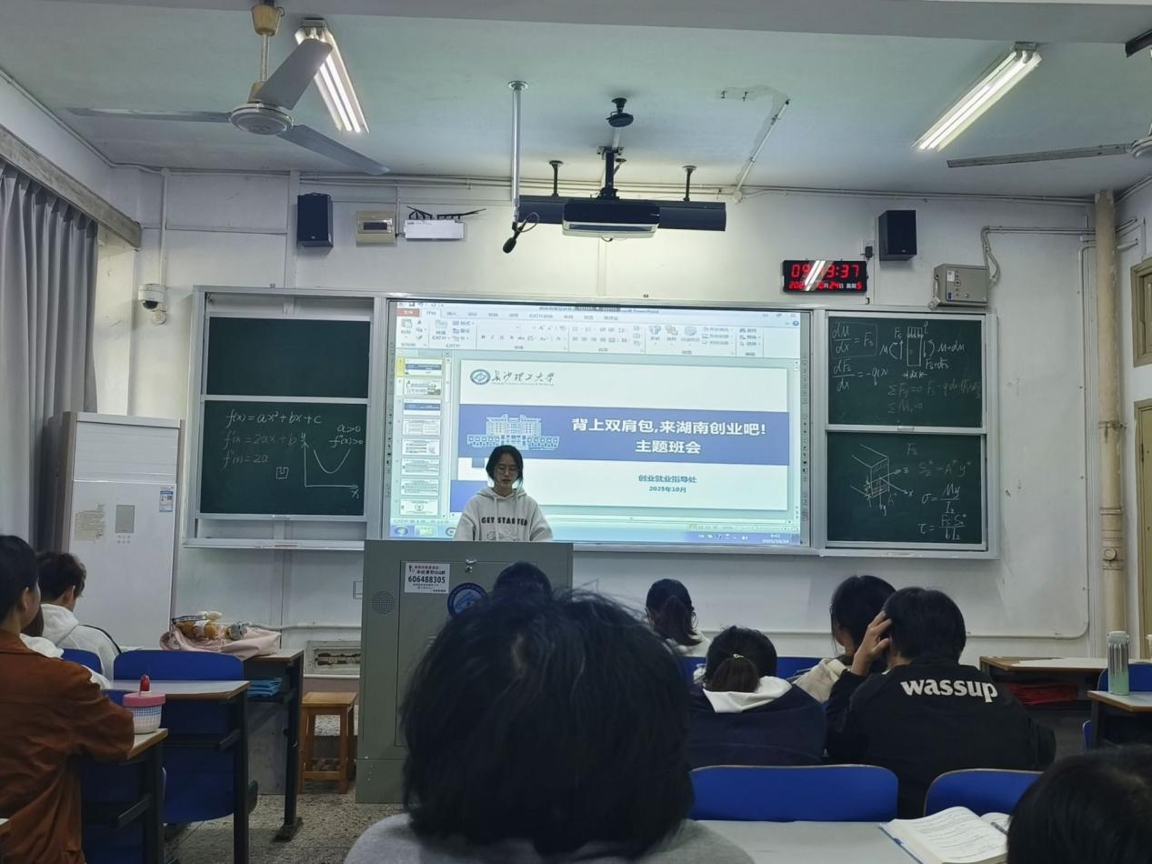 班会中,各班级围绕四大核心内容展开系统学习。首先,通过PPT演示、案例分析等形式,详细解读《湖南省大力支持大学生创业若干政策措施》中的“七个一”举措,包括搭建创业服务平台、落实创业扶持资金、组建导师队伍等关键内容,让同学们清晰了解省级层面的全方位支持。随后,重点学习湖南省教育厅“两直接”政策与永利集团88304官网“三优先”“两配套”“六可以”举措,针对休学创业保留学籍、弹性学制申请、校内场地免费使用等与学生密切相关的条款,逐一明确申请条件与办理流程,现场解答同学们的疑问。