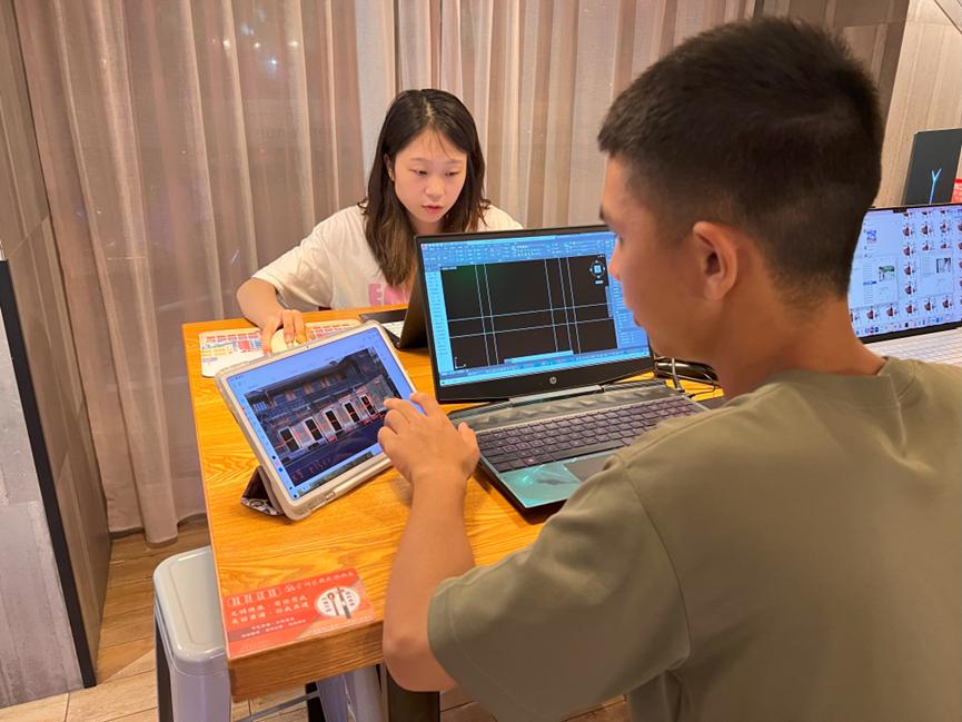 下午,王宇霖老师对实践团员进行了讲解与指导,带领成员使用无人机对建筑整体进行了观测。在无人机观测完毕之后,实践团成员进入建筑内部进行考察和简单测绘。晚上,实践团集中对测得的数据进行整理与备份,并使用制图建模软件,将所得的数据制作成CAD平面图纸和三维模型。实践团在中共二大旧址的观测中学习党史,将专业实践和党史教育紧密联系在一起。