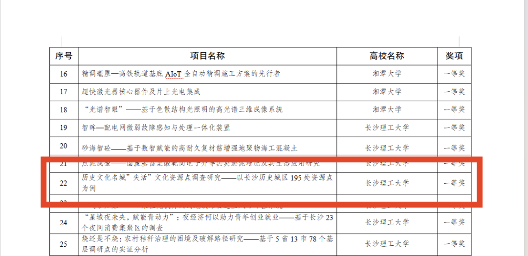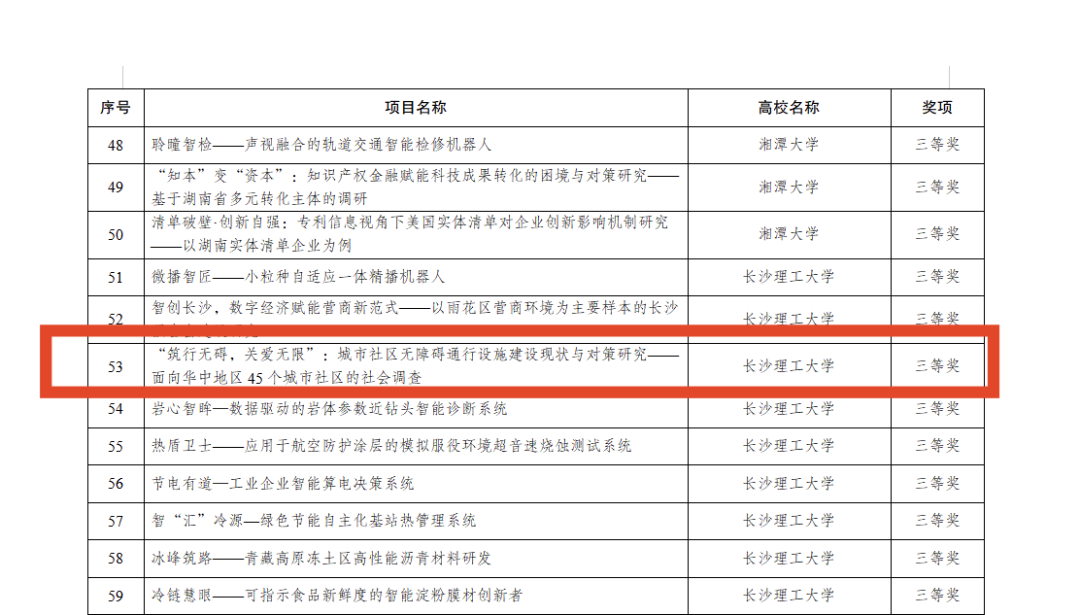 我院《历史文化名城”失活”文化资源点调查研究——以长沙历史城区195处资源点为例》荣获一等奖。指导老师:熊鹰、肖义慧、王宇霖,团队成员:苏垲钧、陈嘉奇、徐鸿毅、吴亚希、彭欣霖、陈鹏辉、李子豪;《“筑行无碍,关爱无限”:城市社区无障碍通行设施建设的新质态研究——面向华中地区45个城市社区的社会调查》荣获三等奖。指导老师:杨斯嘉、周晨、易学尧,团队成员:王易、黄俊峰、肖佳颖、杨雪贞、肖汉权、黄博敏、庄洁、邹旸。