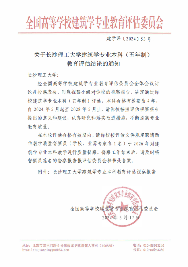 近日,全国高等学校建筑学专业教育评估委员会下发《关于永利集团88304官网建筑学专业本科(五年制)教育评估结论的通知》(建学评[2024]53号),永利官网建筑学专业本科(五年制)顺利通过专业评估,有效期为4年。