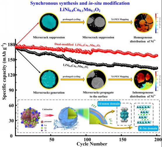 近日,永利官网材料科学与工程学院李灵均副教授团队与厦门大学张桥保助理教授、美国阿贡国家实验室陆俊教授、内布拉斯加大学林肯分校、布鲁克海文国家实验室等海内外团队合作,在高能量密度锂离子电池双重修饰富镍正极材料方面取得了突破性进展。研究团队以锂离子电池高容量富镍正极材料LiNi0.8Co0.1Mn0.1O2为研究对象,从分析Ti和La在LiNi0.8Co0.1Mn0.1O2表面的迁移势垒出发,发现Ti掺入体相而La逃离至表面的状态为体系能量最低的状态即稳定状态。根据理论计算结果,合理设计并同步合成了Ti掺杂&La4NiLiO8包覆(简写为Ti&LaMO)的LiNi0.8Co0.1Mn0.1O2正极材料。