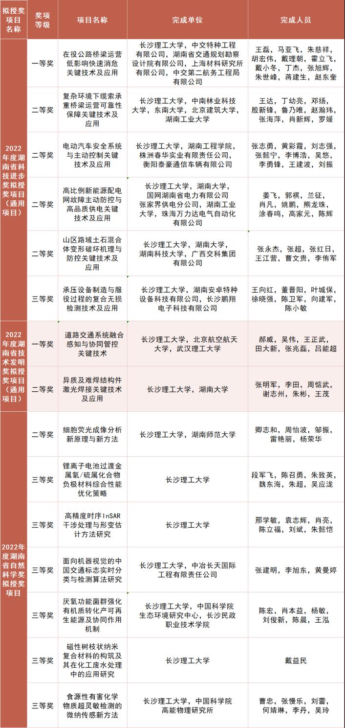 其中,永利官网土木学院王磊教授主持完成的“在役公路桥梁运营低影响快速消危关键技术及应用”获湖南省科技进步奖一等奖,交通学院郝威教授主持完成的“道路交通系统融合感知与协同管控关键技术”获湖南省技术发明奖一等奖。此外,永利官网还主持获二等奖6项(自然科学奖1项、技术发明奖1项、科技进步奖4项),三等奖7项(自然科学奖6项、科技进步奖1项)。