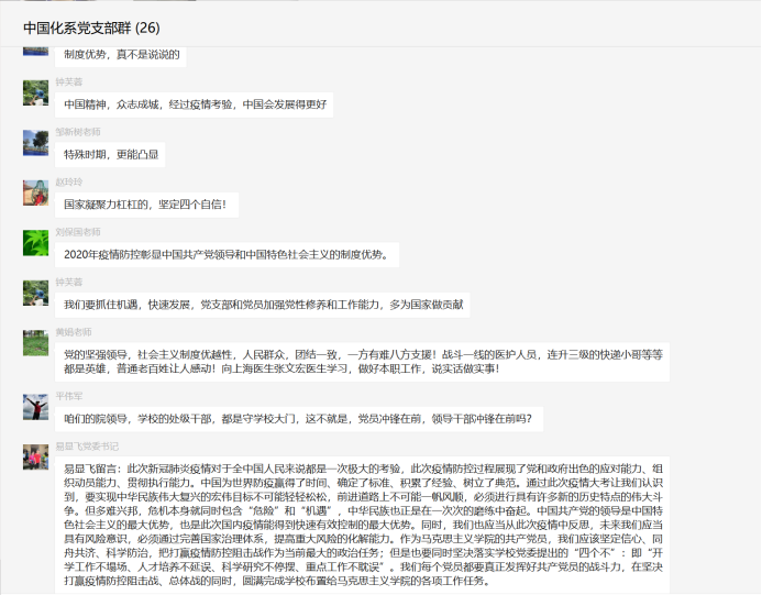 其次,进入个人汇报交流阶段。同志们充分利用强国视频会议和微信群文字交流两种形式展开交流。如工会主席邹新树同志特别强调了中国化系党支部在抗疫防控中确实发挥了先锋模范的作用、余乃忠教授重点强调马院在疫情发生后,已先后发表了4篇抗疫时评,并有2篇被学习强国选用,还有平伟军、施湘元、刘保国、唐俊、钟芙蓉、卞军凤等多位同志都发表了个人所感所思。最后院党委书记易显飞同志进行了精彩的总结。