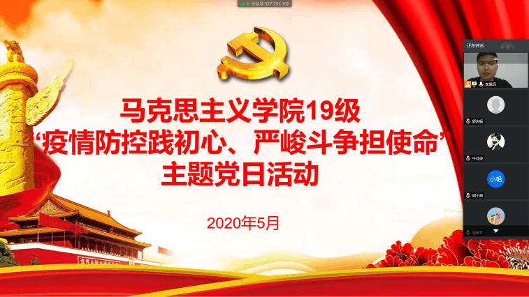 为落实学校党委关于在统筹推进疫情防控工作中的要求,进一步发挥基层党组织战斗堡垒作用和党员先锋模范作用,引导党员在战“疫”中守初心、担使命,永利集团88304官网马克思主义学院2019级研究生党支部结合实际情况,聚集“疫情防控践初心、严峻斗争担使命”的主题,于5月12日下午两点在线上成功召开主题党日活动,参加会议的包括支部所有党员以及勇敢地在此次疫情中奉献的6名积极分子,会议由党支部书记李袁远主持召开。