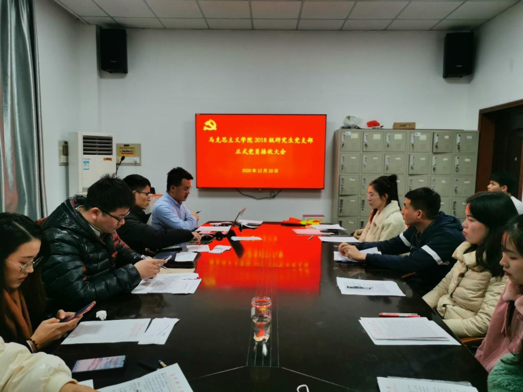 为贯彻落实《中国共产党支部工作条例(试行)》、《中国共产党发展党员工作细则》的相关要求,规范党员发展,确保新发展的党员质量,2020年12月10日,马克思主义学院2018级研究生党支部在四号教学楼503报告厅召开党员大会,对本年度党员发展事宜进行了讨论与表决。会议由支部书记沈康同志主持,全体党员及部分发展对象参加。