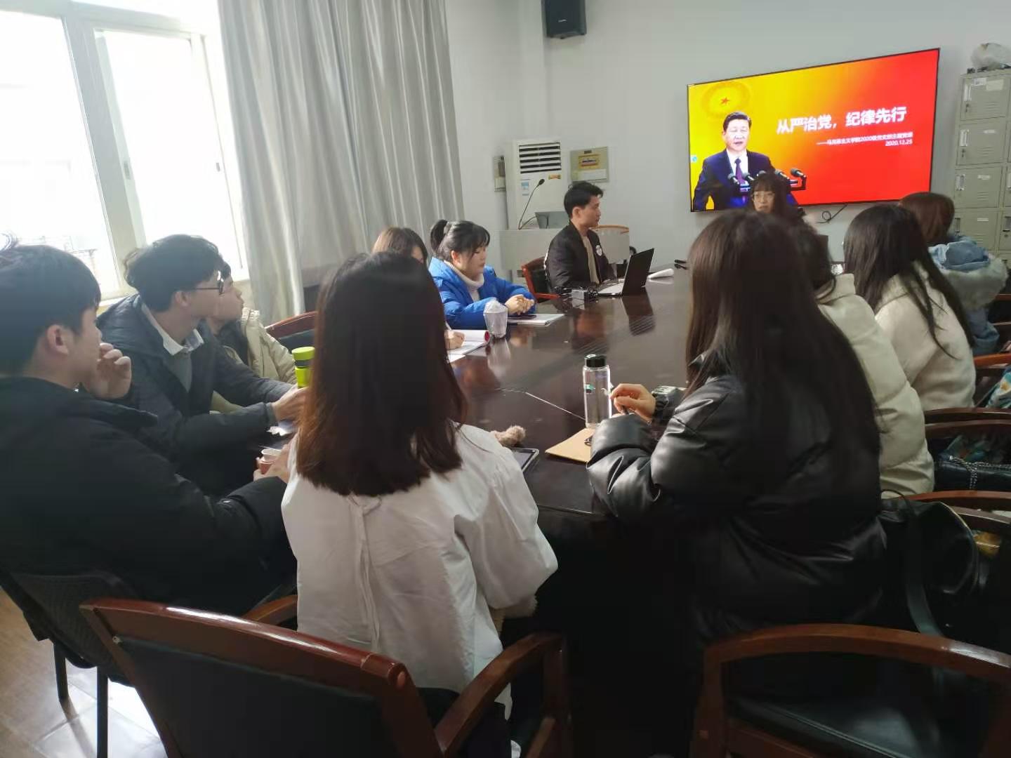 中共永利集团88304官网马克思主义学院2020级研究生党支部全体党员于12月25日上午9:00在四教503集中参加了学党纪党规的党课,全体认真学习了党纪党规。本次党课由党支部书记王静怡与纪检委员侯彭振主持。