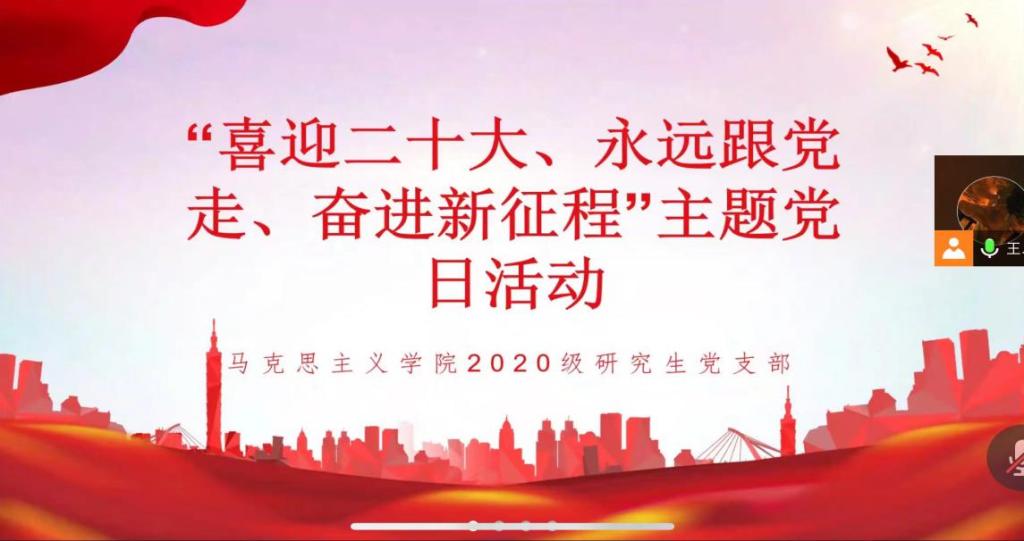 为学习习近平总书记在省部级主要领导干部“学习习近平总书记重要讲话精神,迎接党的二十大”专题研讨班上的重要讲话精神,强化党员身份和使命担当意识,2022年9月28日19时,永利集团88304官网马克思主义学院2020级研究生党支部通过腾讯会议开展本月党员大会暨“喜迎二十大、永远跟党走、奋进新征程”主题党日活动。马克思主义学院2020级研究生党支部全体成员参与学习交流,本次专题学习由支部书记王静怡主持。