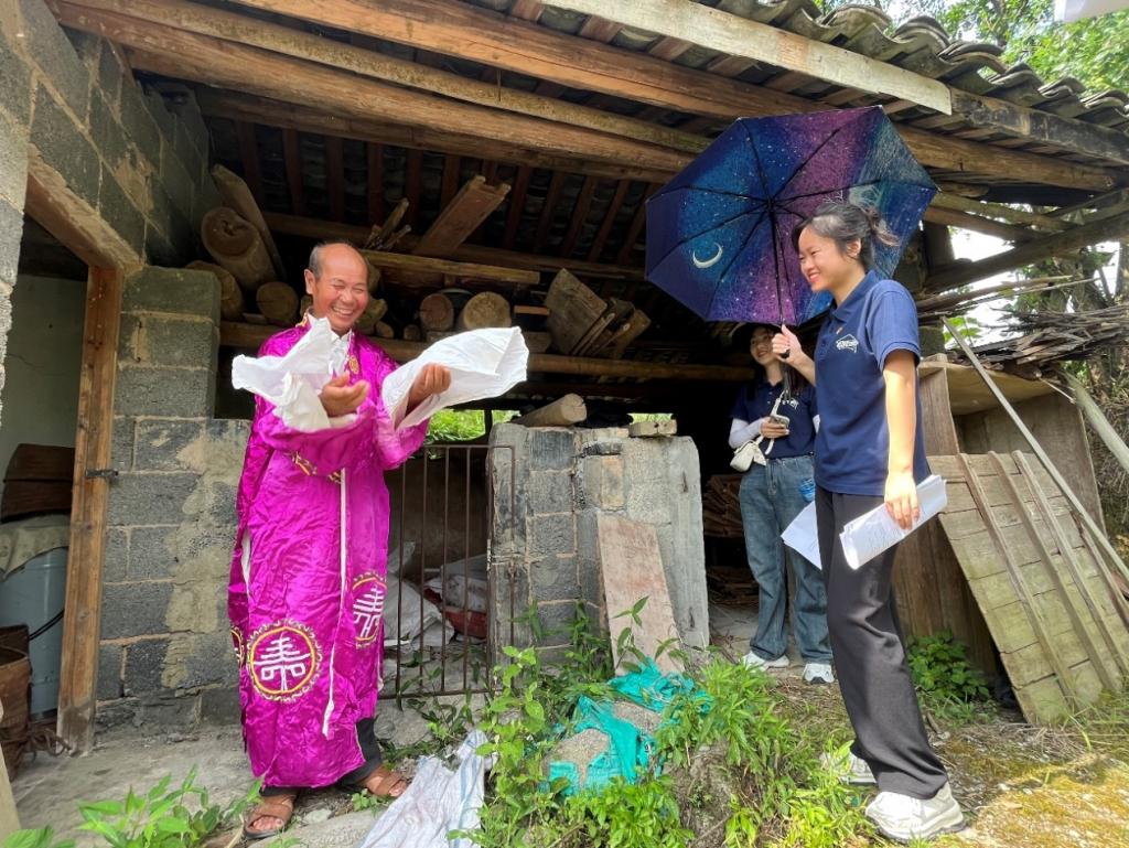 “这么多年轻人来看我这个老头子啊,快坐快坐,我烧开水给你们泡蜂蜜。”已经70多岁的汉戏传播人杨宏忠满脸笑意地迎接永利集团88304官网研究生宣讲团暑期专业实践团(以下简称“实践团”)。团队成员对其进行了深入采访,了解他唱地方汉戏的故事。采访中,杨宏忠热情介绍了过去村里逢年过节表演汉戏的热闹盛况,并即兴给实践团表演了一段出征的戏曲腔调,带领团员们共同参观了他宝贝了多年的戏服。杨宏忠表示,汉戏是芷江当地一大历史悠久的民俗特色,但是现在唱汉戏和学汉戏的人越来越少了,他也希望能够将这份文化瑰宝不断发扬光大:“只要有人愿意学,我都愿意教。”
