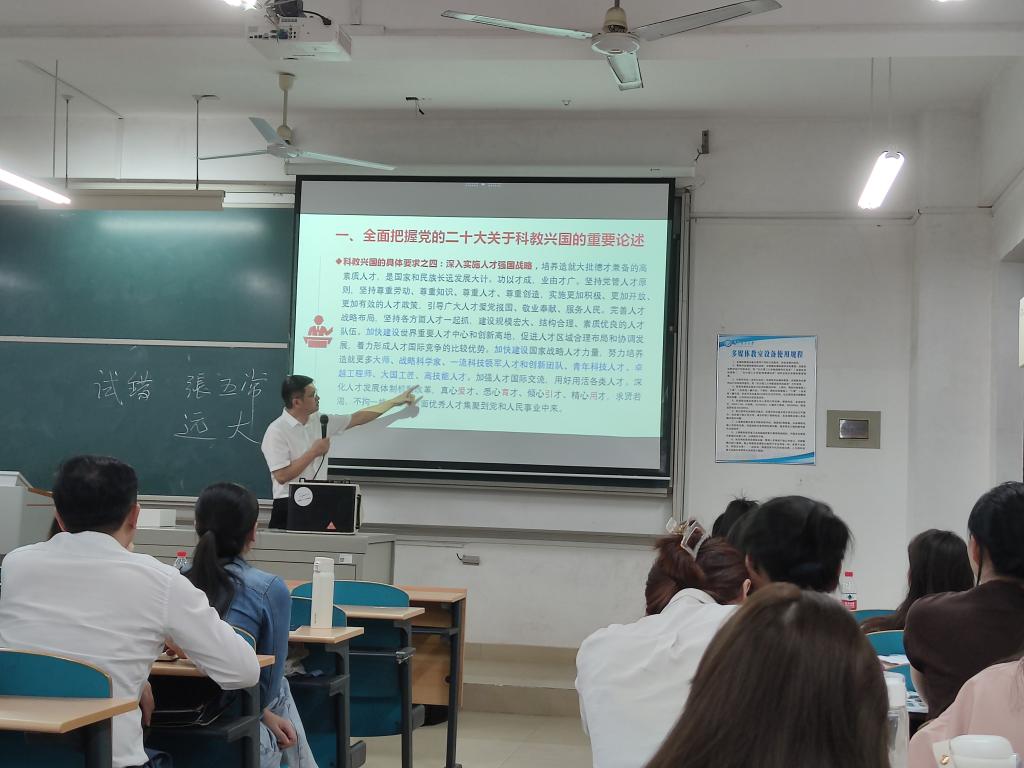 首先,陈书记以华为5Nm高端芯片技术的突破对中国的里程碑意义引入了科技强国战略的必要性与重要性,并指出教育、科技、人才是全面建设社会主义现代化国家的基础性、战略性支撑。接着,陈书记给同学们重点讲解了党的二十大报告中关于科技强国、教育强国、人才强国的具体内容。在讲解过程中,陈书记还以任正非的创业事迹为例,介绍了中国企业家坚韧的个性、独立自主的精神以及贯彻按劳分配的方针,向我们展示了国家发展靠人才,民族振兴靠人才。陈书记还强调到,我国已踏入全面建设社会主义现代化国家的新征程,必须要坚持教育优先发展、科技自立自强、人才引领驱动的发展战略,全面提高人才自主培养质量,着力造就拔尖创新人才,聚天下英才而用之。