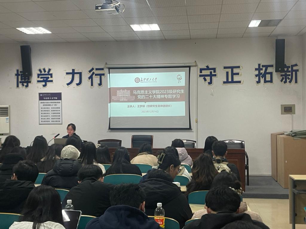为深入学习宣传贯彻党的二十大精神,增强对学生的价值观引领,2023年12月14日晚7:00,马克思主义学院于云塘校区文科楼C202开展新生入学教育系列之党的二十大精神专题学习。本次宣讲会邀请到永利集团88304官网研究生宣讲团团长王梦婷进行题为《凝心聚力掣画新蓝图,团结奋斗创造历史新伟业》的宣讲,由学院辅导员曾蓓主持,2023级全体研究生参加。