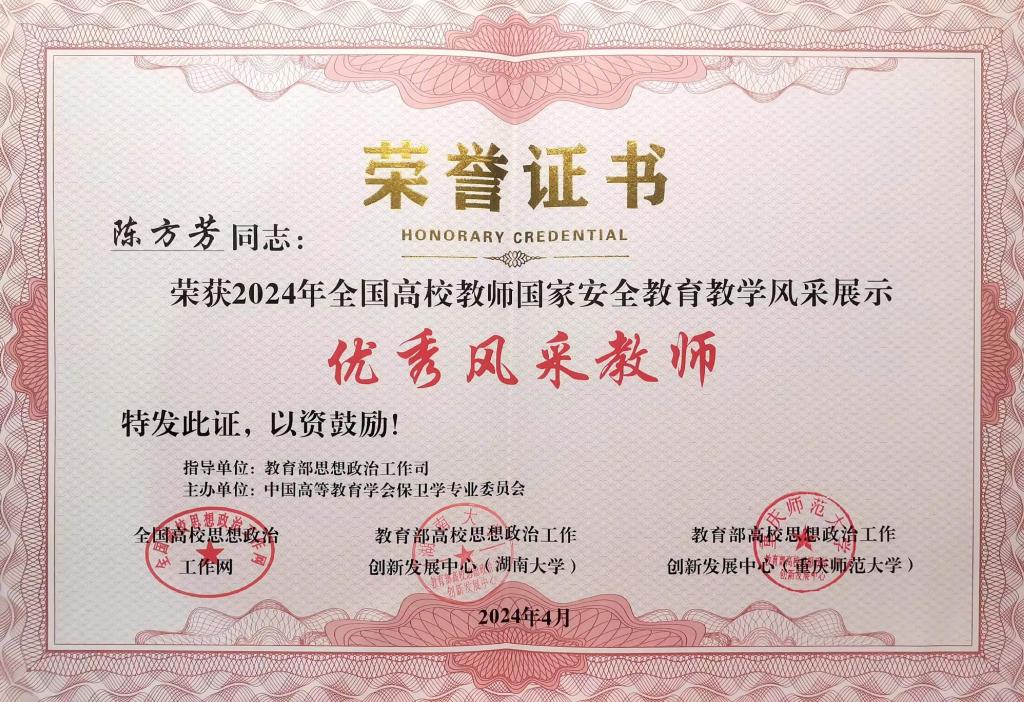 2024年是习近平总书记提出总体国家安全观10周年,4月15日迎来第九个全民国家安全教育日。为深入贯彻落实习近平总书记关于加强国家安全教育的重要指示批示精神,围绕“总体国家安全观·创新引领10周年”活动主题,进一步增强高校教师国家安全教育素养和教学技能,由教育部思想政治工作司指导,中国高等教育学会保卫学专业委员会、全国高校思想政治工作网、教育部高校思想政治工作创新发展中心联合主办的“2024年高校教师国家安全教育教学风采展示”活动于4月11日在重庆师范大学博雅楼举行,我院教师陈方芳经学校保卫处推选,在本次展示活动中获得“优秀风采教师”荣誉称号。