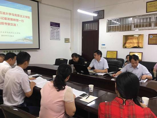 2019年7月8日星期一,西南石油大学马克思主义学院党总支书记崔发展教授一行来我院考察交流,双方在永利官网云塘校区文科楼B601会议室进行了学习交流。出席交流会的有我院陈万球院长、梁建新副院长、教授委员会主任余乃忠以及西南石油大学马克思主义学院党总支书记崔发展、教务处副处长张华春、副院长潘建屯、教授委员会主任蒋朝莉、形策教研室主任徐科琼。会议由陈万球院长主持。