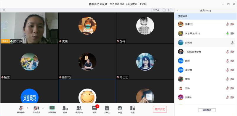 随后在曾老师主持下,同学们就当前疫情防控工作中的思想认识、工作情况、学习情况结合自身实际向全班同学做了汇报。沈康同学身处武汉疫情重区,在线分享武汉的疫情,他说道“现在的武汉比之前有所放松,归零的社区可以在社区内活动,生活的必备物资依然有配送。同时在导师的督促下,积极进行小论文的书写。”紧接着志愿者唐梓杰、谢扬、周香兰、张晨等分享了自己身边的所做、所见、所闻和所感;学习上和在学校差不多,主要以自己看书、写论文为主。同时,曾老师通过全面细致的调查了解到2018级研究生中有沈康、程哲、刘壮3名湖北籍的同学,特别关注他们的健康、生活和学习情况,请他们分享了自己和家人的近况。全体同学在线上给他们进行了“云打气”,希望他们保护好自己的同时照顾好家人,等待开学校园相聚。
