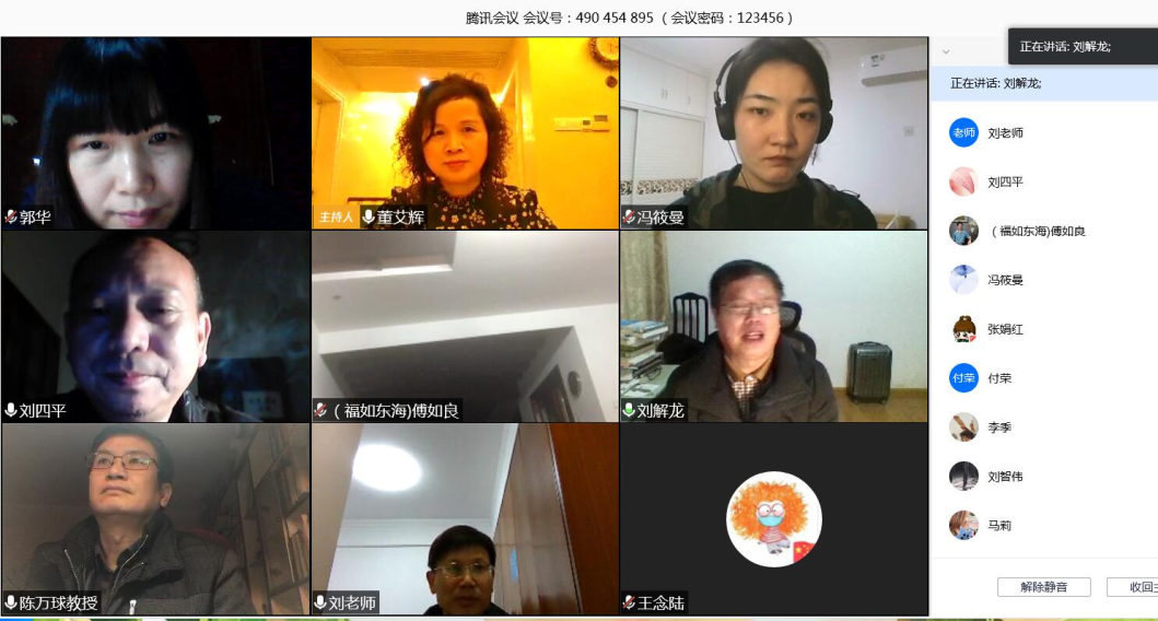 下图为3月28日晚上7点,马克思主义学院17级马原和科社专业11名同学,通过腾讯会议新型网络形式进行线上预答辩。预答辩委员会由陈万球教授、傅如良教授、刘解龙教授、刘保国教授、董艾辉教授和刘四平副教授六位专家构成,刘解龙教授主持,郭华老师任预答辩秘书。