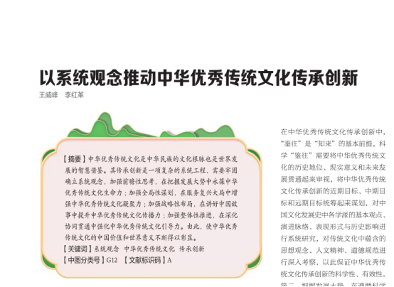 摘要:中华优秀传统文化是中华民族的文化根脉也是世界发展的智慧借鉴。其传承创新是一项复杂的系统工程,需要牢固确立系统观念,加强前瞻性思考,在把握发展大势中永葆中华优秀传统文化生命力;加强全局性谋划,在服务复兴大局中增强中华优秀传统文化凝聚力;加强战略性布局,在讲好中国故事中提升中华优秀传统文化传播力;加强整体性推进,在深化协同贯通中强化中华优秀传统文化引导力。由此,使中华优秀传统文化的中国价值和世界意义不断得以彰显。