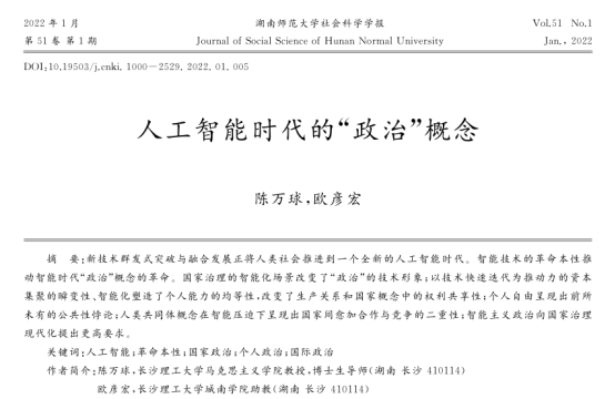 摘要:新技术群发式突破与融合发展正将人类社会推进到一个全新的人工智能时代。智能技术的革命本性推动智能时代“政治”概念的革命。国家治理的智能化场景改变了“政治”的技术形象:以技术快速迭代为推动力的资本集聚的瞬变性、智能化塑造了个人能力的均等性,改变了生产关系和国家概念中的权利共享性;个人自由呈现出前所未有的公共性悖论;人类共同体概念在智能压迫下呈现出国家间愈加合作与竞争的二重性;智能主义政治向国家治理现代化提出更高要求。