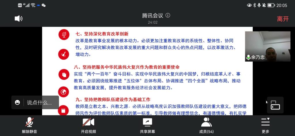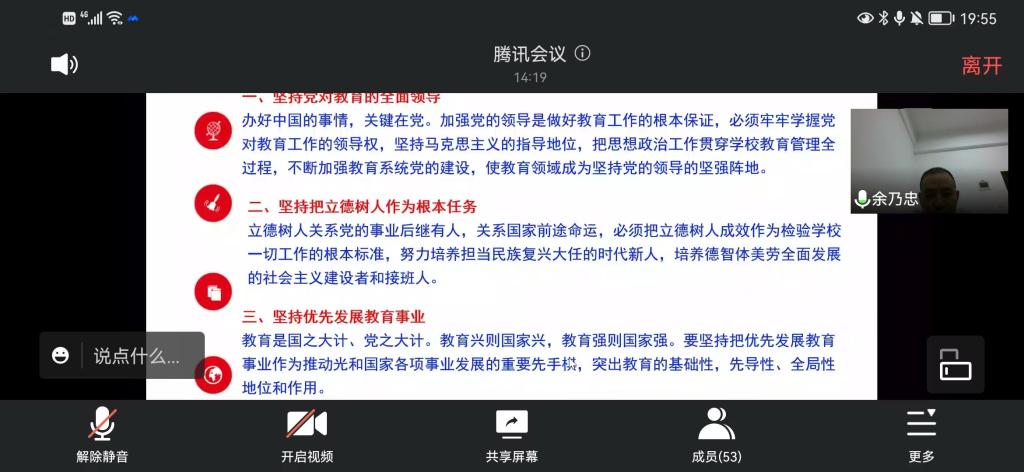 5月24日晚19点30分,马克思主义学院党委组织全院教职工开展习近平总书记关于教育重要论述专题理论的线上学习,本次专题学习由余乃忠教授主讲,学院党委书记易显飞教授主持。