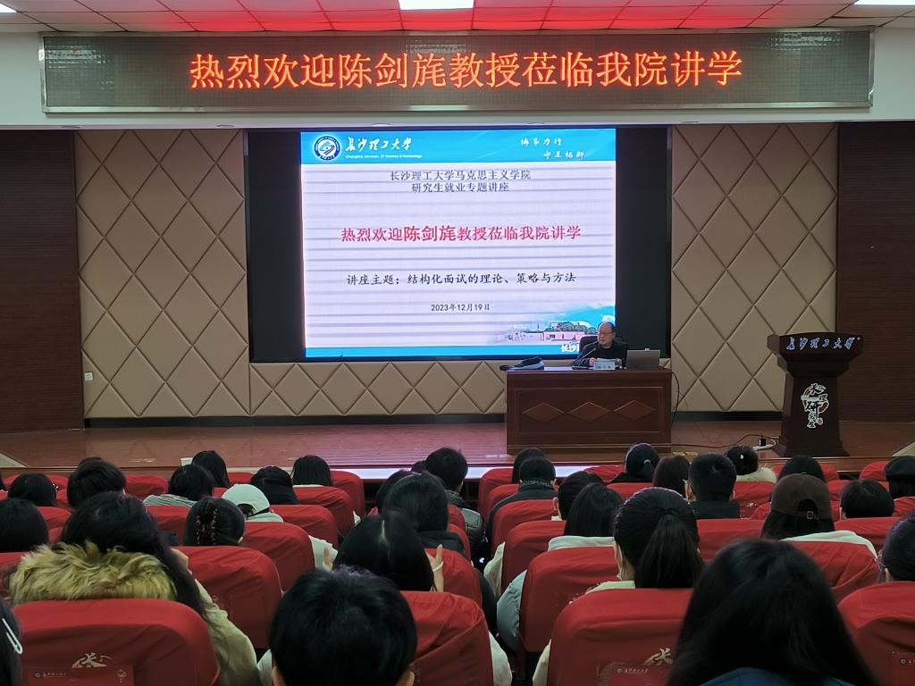 12月19日下午,湖南信息职业技术学院原院长陈剑旄教授应邀来到马克思主义学院,在云塘校区文科楼A200报告厅作了题为“结构化面试的理论、策略与方法”的就业专题讲座。本次讲座由院党委书记陈万球教授主持,院长张明海教授、副院长李雨燕教授以及我院研究生150多人参加了讲座。