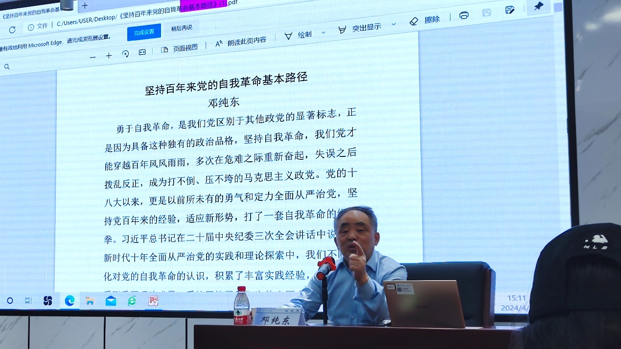 4月2日下午,中国社会科学院马克思主义研究院原院长、党委书记、博士生导师邓纯东教授应邀来到马克思主义学院,在永利官网云塘校区文科楼D207作了题为“坚持百年来党的自我革命基本路径”的学术讲座。讲座由文贵全副院长主持,学院部分老师和一、二年级研究生参加了讲座。