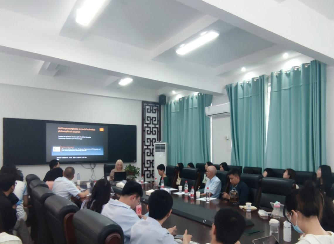 4月27日下午,俄罗斯联邦彼尔姆国立理工大学(Perm National Research Polytechnic University)Elena Seredkina(白雪)教授来到马克思主义学院,在永利官网云塘校区文科楼B602会议室作了题为“社交机器人拟人化的哲学分析”的学术讲座。本次讲座由马克思主义学院文贵全副院长主持,余乃忠教授、陈芬教授、蒋显荣教授、廖苗副教授、郭蓉博士等学院部分教师和马克思主义学院2023级哲学、公共管理专业研究生近50人聆听了讲座。此外,广西科技大学黄磊助理教授也参加了本次讲座。