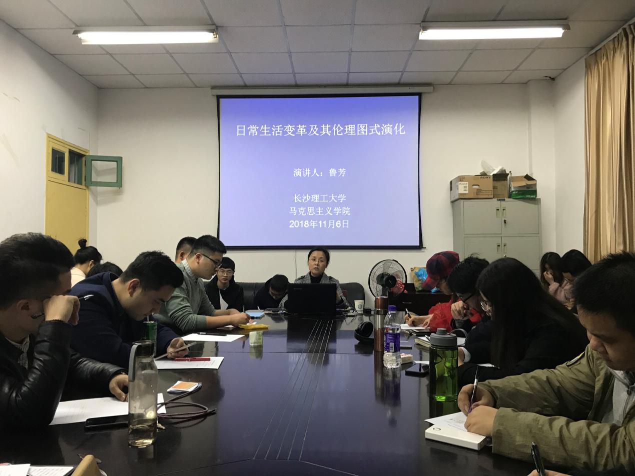 2018年11月6日晚七点半,永利集团88304官网马克思主义学院鲁芳教授在金盆岭校区四教503会议室为全院2018级哲学、马理论专业研究生带来了一场题为“日常生活变革及其伦理图式演化”的专题讲座。