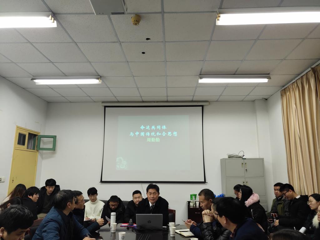 2018年12月9日晚7点,中国社会科学院大学人文学院首席教授,国家社科基金项目评审专家周勤勤教授,应邀在永利官网金盆岭校区4教503室主讲了题为“命运共同体与中国传统和合思想”的学术报告。马克思主义学院陈万球院长、教授委员会主任余乃忠教授、部分教师和研究生参加了此次讲座。讲座由陈万球院长主持。
