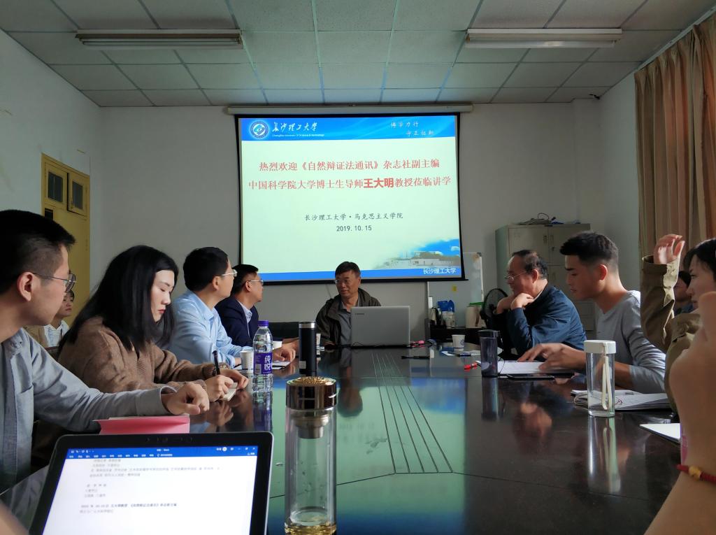 2019年10月15日下午,《自然辩证法通讯》杂志社副主编、中国科学院大学人文学院社会科学系博士生导师王大明教授应马克思主义学院邀请,在永利官网金盆岭校区4-503室作了题为“狭义与广义大科学辨析”的学术讲座。马克思主义学院陈万球院长、林慧岳教授、文贵全博士等部分教师与学院研究生参加了此次讲座,本次讲座由陈万球教授主持。