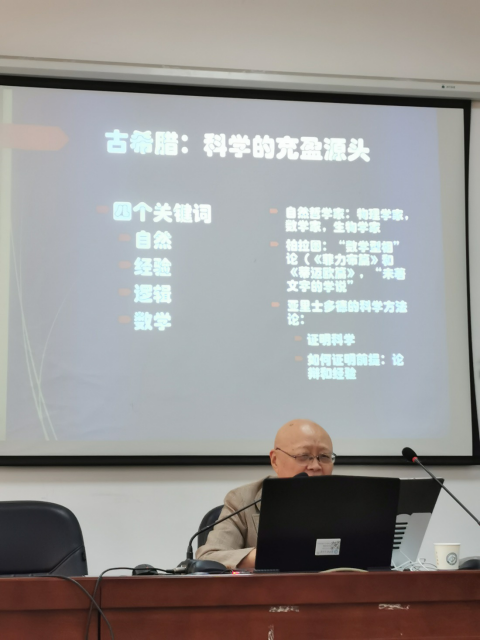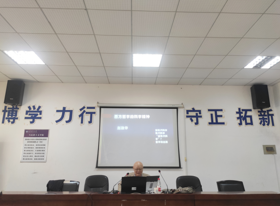 陈万球教授首先向在座师生简要介绍了赵敦华教授的学术经历与学术成就,对赵敦华先生前来永利官网讲学表示热烈欢迎与诚挚感谢。赵教授的讲座以学科发展时间为脉络,从前现代科学、现代科学、后现代科学三个阶段梳理了西方哲学的科学精神,分析了科学危机与科学革命的动力,并详细阐释了哲学的几次大危机。赵教授认为,古希腊作为科学的充盈源头,其哲学包含了四个关键词,即自然、经验、逻辑和数学。古希腊哲学家们对宇宙万物本源的探索本身具有很强的科学性,这使古希腊哲学具备着所有科学要素的萌芽。赵教授指出,从哲学史上的事实来看,哲学经历了多次危机,每一次危机后都迎来哲学的繁荣发展。现今科学技术尤其是人工智能技术发展迅猛,不断冲击着当前的哲学理论。哲学的当代转型是必然的,其应该与科学技术在新时期形成同盟。