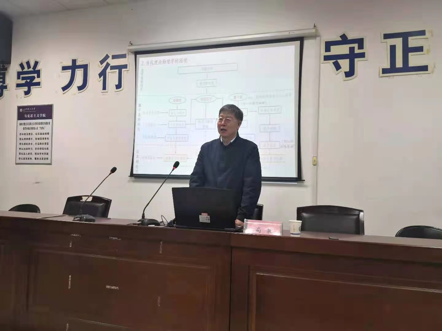 高策教授的学术报告题目是《当代理论物理对传统科学哲学的挑战》。报告的主要内容有:20世纪物理学革命与科学哲学的兴起;当代理论物理学的困境与传统科学哲学的当代困境;前沿物理学理论中的哲学及走向后真相时代的科学哲学。最后,高教授基于上述,提出了如下几个问题:未来科学哲学将走向何方?理论物理学存在的诸多困境对于科学哲学意味着什么?走向后真相时代的科学与后真相时代的科学哲学“何以可能”?学术报告后,在场师生踊跃提问,高教授一一给予了回答。最后,易显飞对本场学术报告进行了点评。