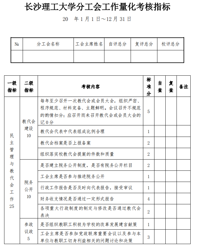 1.各分工会在撰写年度总结时,应按照上述考核内容和《永利集团88304官网分工会工作量化考核指标》给出自评分数,提交教代会或者按照教代会程序召开的教职工大会全部装订资料、年度工作计划和工作总结(含特色工作)。