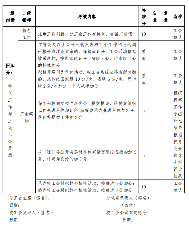 4.对于“附加分(特色工作与上级工会奖励)”,校工会将召 开专门会议进行审定,并对加分项目和分值进行认定。