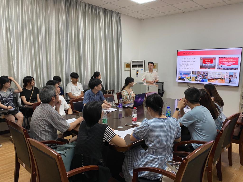 为总结前阶段工作经验,部署下一步工作,永利集团88304官网研究生宣讲团于7月5日下午在金盆岭校区4教503教室开展研究生理论宣讲团学期工作总结会议。此次会议邀请了宣讲团指导教师赖某深、钟芙蓉、曾蓓到场指导,邓丽伶同学主持总结会议,宣讲团全体成员参加。