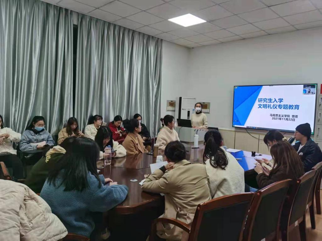 2021年11月22日晚上8:30,主题为研究生入学文明礼仪专题教育班会在4教501和503开展。本次文明礼仪专题教育班会由辅导员曾蓓主讲,2021级全体研究生参加。
