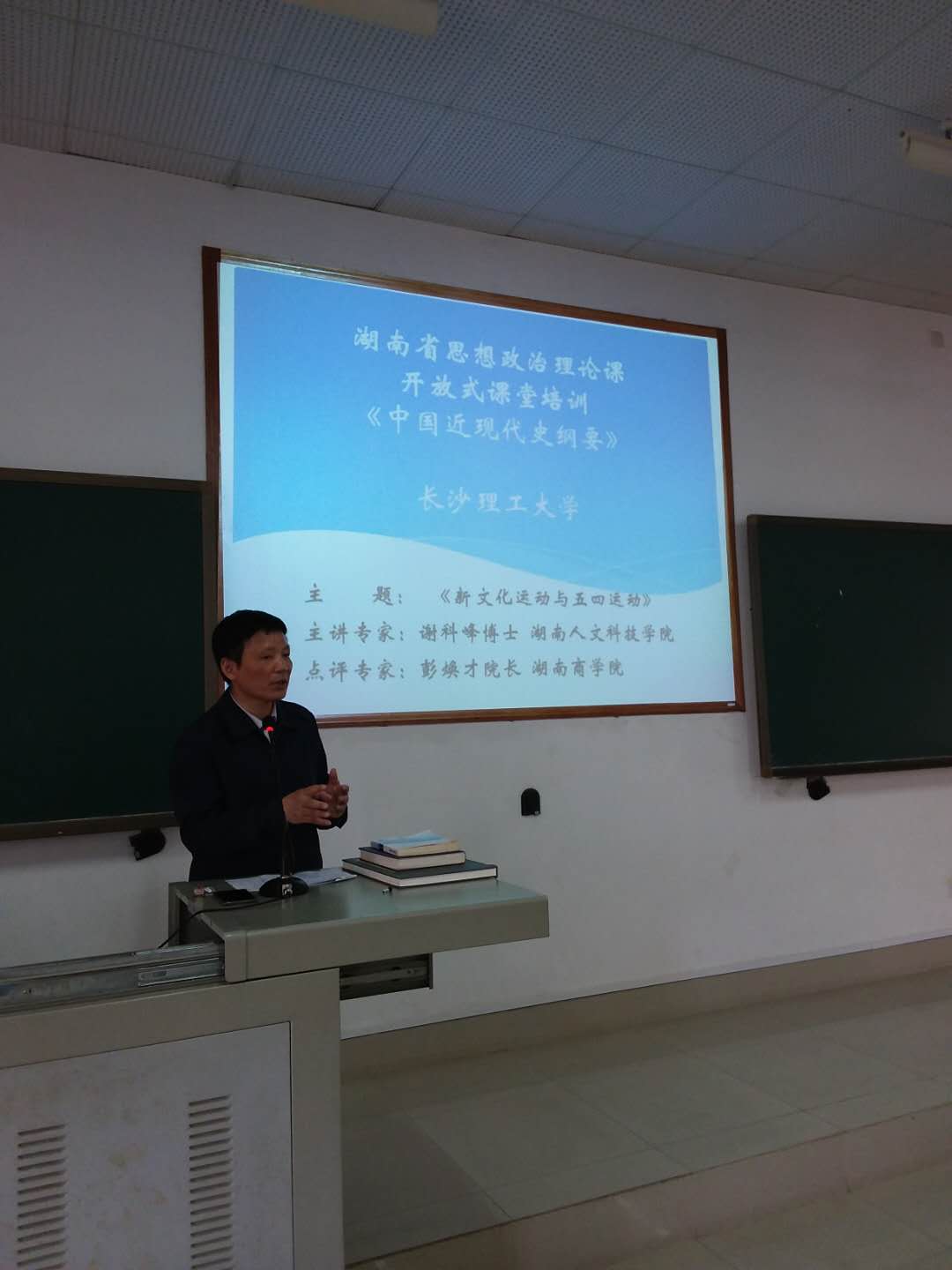 4月19日下午,由湖南省委教育工委组织、永利官网承办的《中国近现代史纲要》开放式课堂第二课在云塘校区综合楼举行。此次开放式课堂由来自湖南人文科技学院马克思主义学院的谢科峰博士讲授,永利集团88304官网马克思主义学院副院长梁建新教授主持,湖南商学院马克思主义学院院长彭焕才教授点评。来自湖南师范大学、湘潭大学、湖南农业大学等省内30多所高校的40余位教师,以及永利官网马克思主义学院30余位教师现场观摩。