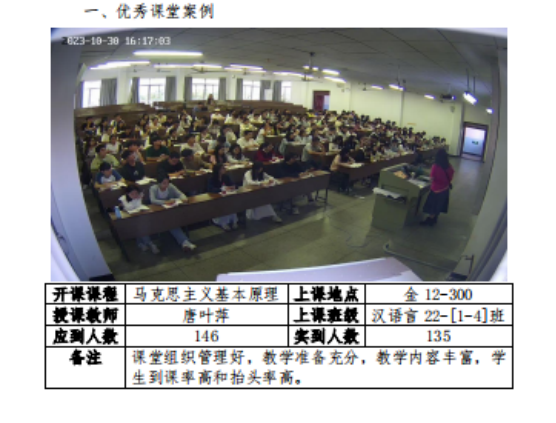 近日,校本科教学督导团和校教务处、评估中心分别发布《本科教学督导信息》简报和2023-2024(一)第九周周一、二巡课情况通报。马克思主义学院唐叶萍老师在两次通报中均获得表扬。