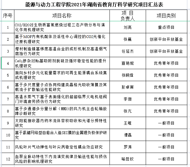 根据永利集团88304官网科学研究部《关于申报2021年湖南省教育厅科学研究项目的通知》文件精神,经个人申报,学院组织专家评审,拟推荐“C02/H20对生物质富氧燃烧过程三态产物分布与演化作用机理研究”等12项项目申报2021年湖南省教育厅科学研究项目,具体名单如下: