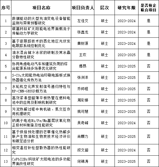 根据湖南省教育厅湘教通〔202368号《关于申报2023年湖南省研究生科研创新项目的通知》及《永利集团88304官网研究生创新工程管理暂行办法》([2020]28)文件的精神,经个人申报,学院组织专家评审,拟推荐“数据驱动的大型充油变电设备智能检测与异常预警研究”等13省级研究生科研创新项目“新型复合熔盐相变储热体系的优化设计及应用研究”等7项校级研究生科研创新项目参加学校评审。具体名单如下: