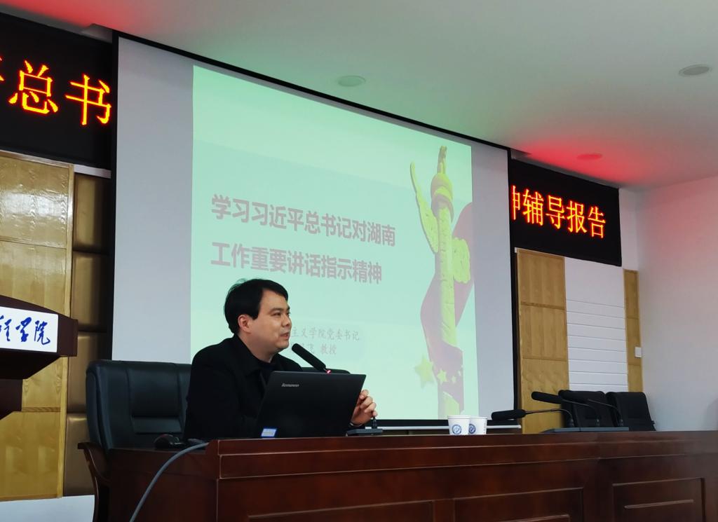 会议伊始,易显飞从十个方面详细介绍了湖南省发展的优势、不足和现状,深入分析习近平总书记对湖南工作重要讲话指示精神的内涵。他指出:“推动湖南经济高质量发展需要牢记习近平总书记的嘱托,坚持理论与实践相结合,切实找准教育教学、科研创新与全省发展大局的结合点,引导广大师生积极投入经济建设主战场,主动参与我省产业发展的火热实践。”