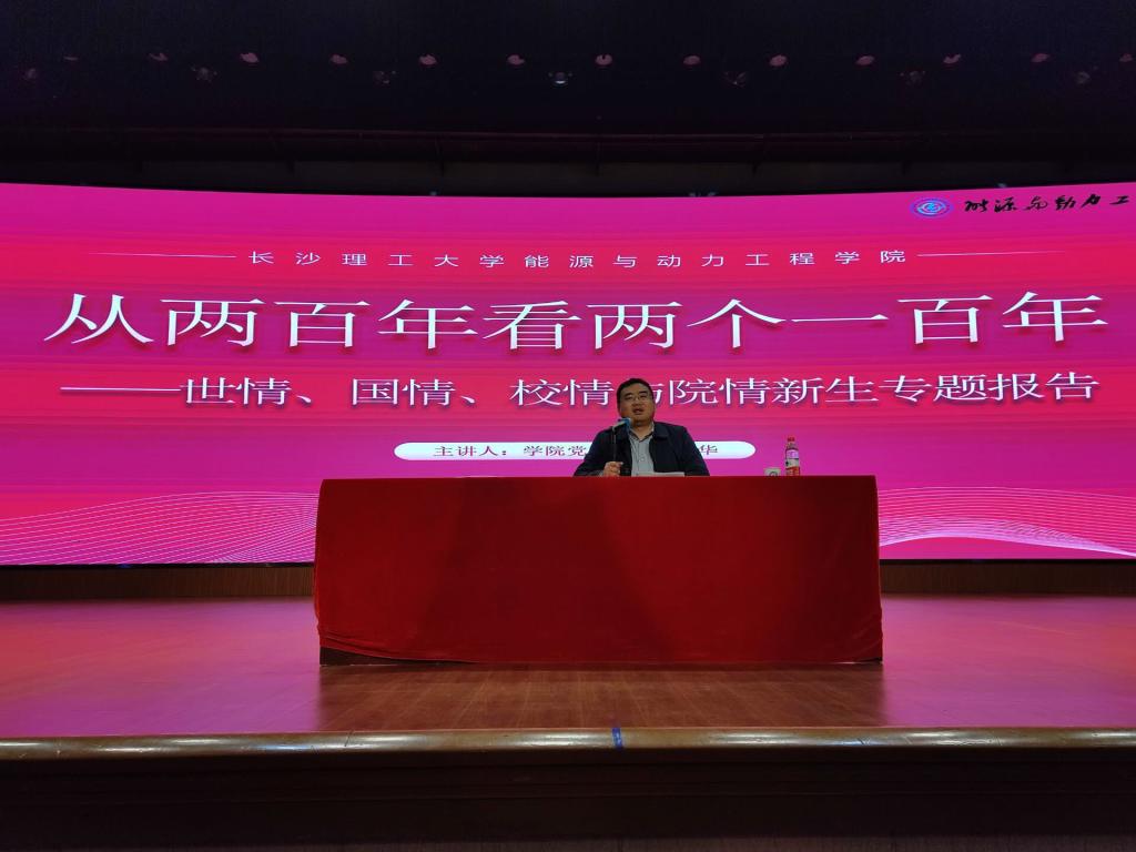 报告横跨两百年的历史,成华分阶段介绍了中华民族的屈辱史和奋斗史,他指出,在场的同学出生、成长于中国最安定、发展最迅速的时期,引导大家即便是在安稳的岁月中也要加强忧患意识与斗争精神。接着,成华为全体新生介绍永利集团88304官网的历史,这是一所承载着时代责任、国家嘱托,伴随着共和国的发展共同成长的一所高校,也为大家讲述了学校发展的重要历史意义和使命责任。成华重点介绍了学院的发展历史,以及杰出校友在祖国一线前沿奋斗的事迹,发出“每一个能动人都应该找到自己的使命与价值,投入火热的能源建设事业,将历史与责任延续,把红色的江山建设得更加美丽”的号召,激励每一位能动人始终以国家“双碳”目标为己任,为构建绿色中国、低碳中国、美丽中国贡献力量。