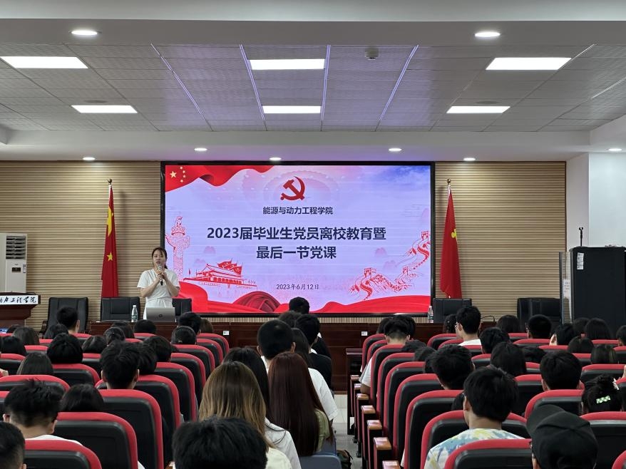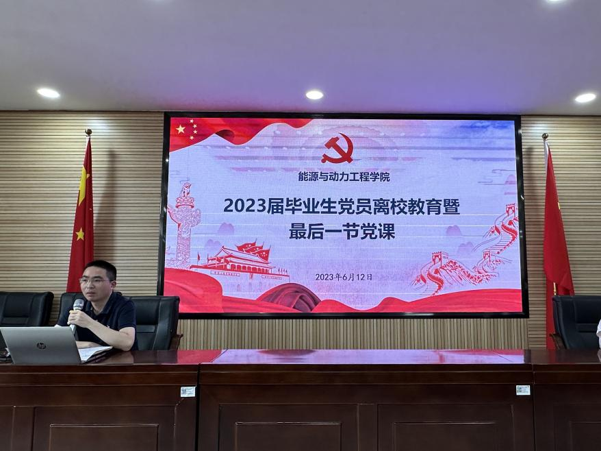 6月12日下午,能源与动力工程学院在新能源大楼2栋502召开2023届毕业生党员离校教育暨最后一节党课,党课由学院党委副书记兼副院长张晓烽主讲,活动由学生党建辅导员罗亦欧主持。