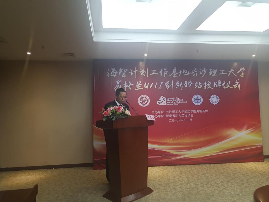 11月4日下午,2018年中国科协“海外智力为国服务行动计划”(称海智计划)工作基地UHI驿站永利集团88304官网合作伙伴授牌仪式在永利官网国际学术交流中心举行。出席授牌仪式的有永利集团88304官网国家外专局高端外国专家、英国高地群岛大学(UHI)副校长Stuart Gibb教授、永利集团88304官网纪委书记胡永乐、湖南省科协调宣部部长李云、湖南省动力工程学会副秘书长王维丽,能动学院党委书记陈冬林、副院长何建军、能动学院国际交流中心主任向健平以及能动学院师生代表。