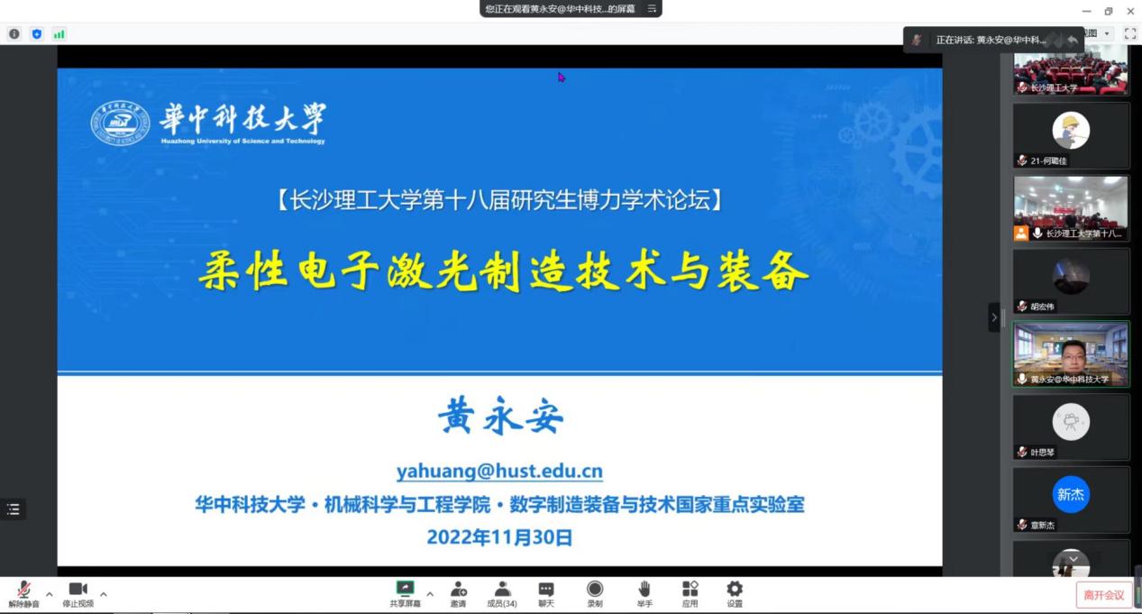 2022年11月30日9:40,华中科技大学教授、博士生导师,数字制造装备与技术国家重点实验室副主任、国家杰青黄永安教授受汽机学院邀请做客永利官网第十八届研究生博力学术论坛“智能车辆与智造前沿”专题论坛。本次报告由汽机学院副院长胡林主持,副院长毛聪、副院长尹来容、章杰、罗源嫱、王丹琦等教师及部分研究生参加了本次报告。