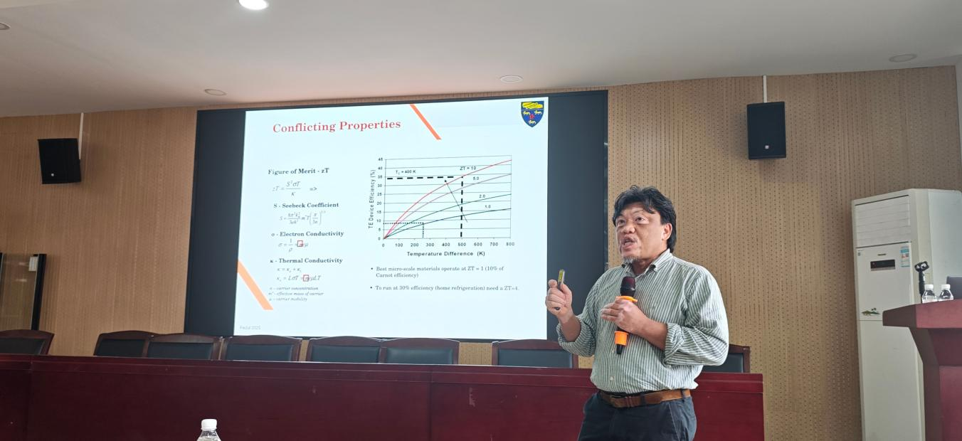 Faizul教授在报告中指出,热电发电机可将废热直接转化为电能,是提升能源效率、助力碳中和的重要技术。他重点介绍了方钴矿材料的掺杂与纳米结构调控策略,并通过多元素双填充(如Al、Yb、In、La等)提升品质因数ZT。此外,还分享了电沉积制备CoSb₃厚膜、离子凝胶、PVDF微能量采集以及热电冷却在海水淡化中的应用成果。