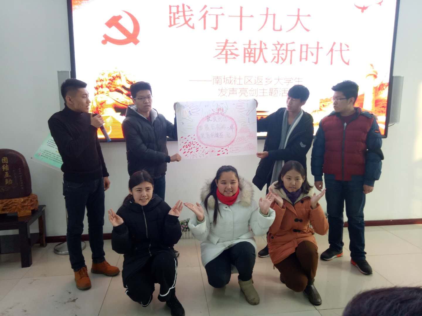 在村民院子、在校园课堂、在社区广场、在火车途中……党的十九大精神以民生调查、手绘画、社区志愿活动等喜闻乐见、深入人心的形式被带到城市居民与农村村民家。学院参照校“党的十九大精神宣讲团”做法,上学期末,学院选配党员骨干进行宣讲示范,做好老百姓的特殊“翻译官”,攻破理论宣讲重点与难点,真正让老百姓了解民生实事,使老百姓们听得好、能领会、记得牢。学生党员们谨记“不忘初心、牢记使命”,在不同地方不同场景宣扬十九大精神,让党的光辉照耀前行。