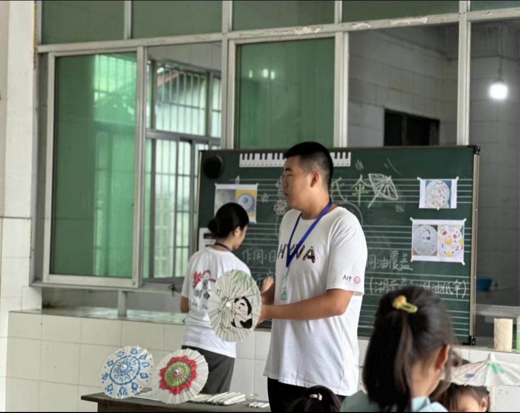 在动手实践环节,实践团队员们提前布置好场地,为每位孩子分发了油纸伞坯、画笔以及各色颜料。在队员们的耐心指导和示范下,孩子们仔细观察了上色的基本技巧,随后便投入到自由的创作之中。孩子们充分发挥想象力,在素雅的伞面上尽情挥洒色彩。有的描绘花鸟鱼虫,有的勾勒山水意境,有的尝试抽象图案,一把把普通的伞坯逐渐被赋予了个性化的艺术生命。支教团成员们穿梭其间,及时给予指导和鼓励,现场气氛热烈而融洽。