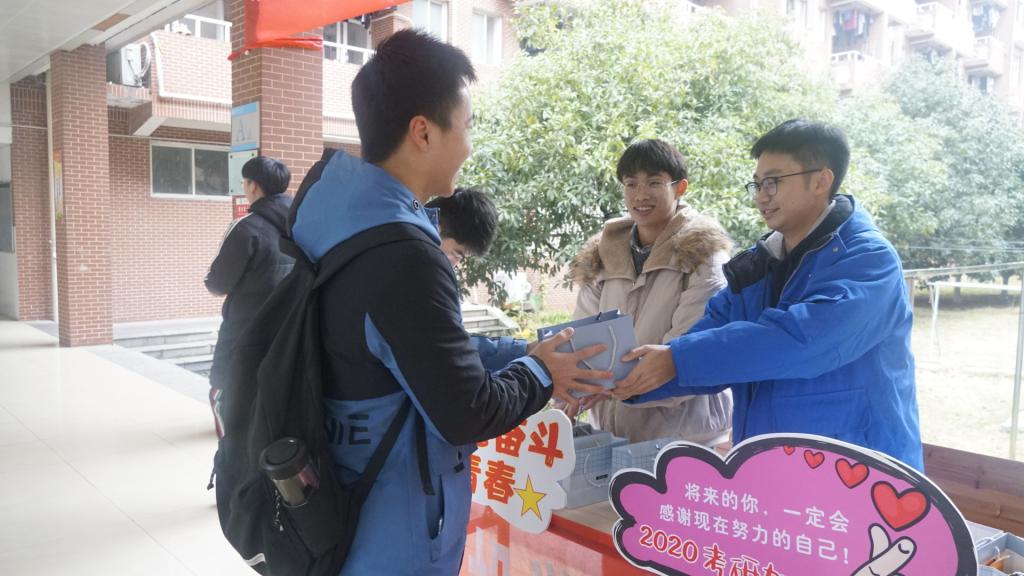 旺旺、暖贴、祝福卡片……“五福袋”惊艳了不少考研学子。祝福卡上写着师生的祝福语,暖心的礼物配上鼓励的话语,同学们纷纷表示被暖到了。“考研备战,展现了你们‘修业、敬业、乐业、精业’的汽机精神,决战时刻祝你们成功。”汽机学院院长杜荣华的祝福,道出了学院对所有考研学子的殷殷期望。毕业生辅导员李特超介绍,“五福袋中装有士力架补充能量,是能量福;旺旺牛奶祝大家考试旺,是旺旺福;保暖贴不仅御寒更暖心,是暖心福;苹果寓意平平安安,是平安福。特别是祝福卡,是学院师生代表为考研学子撰写的温馨祝福。”发放福袋后,老师们为在场的考研学子写下了亲笔祝福。